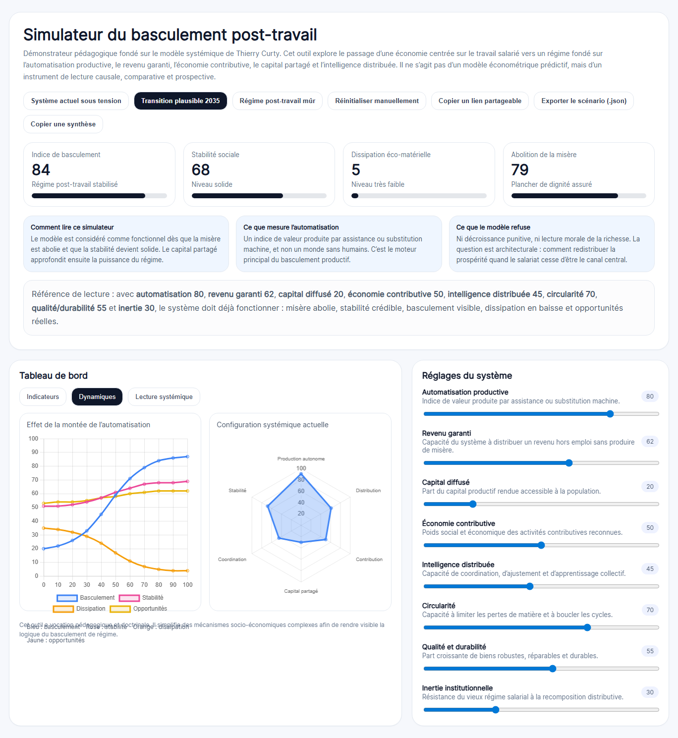 Cette confiance est légitime. Le simulateur ne prétend pas donner le dernier mot sur le futur. Il donne quelque chose de tout aussi précieux à ce stade : une représentation intelligible, crédible et structurée des conditions dans lesquelles un régime post-travail peut émerger et se stabiliser.